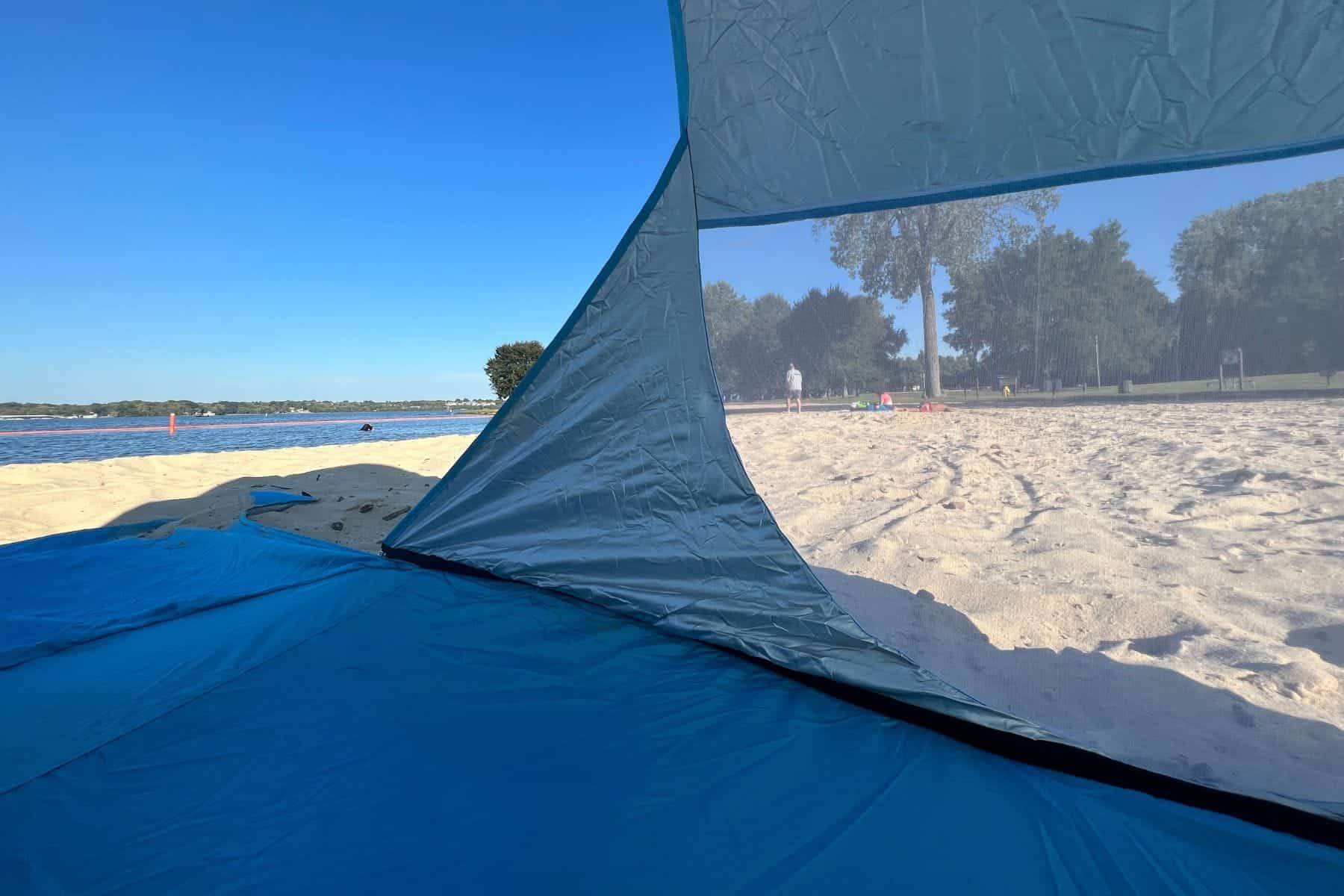 The silver-coated UV-resistant fabric is draped to provide almost 360-degrees of shade, with the only opening being toward the beach, with a couple of low window openings on each side. We were a bit disappointed that the mesh windows don’t provide optional coverings, but ultimately, we found it did a good job of providing shade, if not privacy.