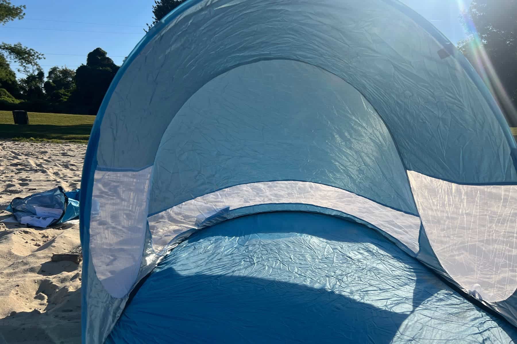 The shape is a bit odd compared to the other beach tents we have reviewed, with a sort of tunnel design. While it admittedly looks a little strange, it proved to be pretty advantageous in providing more complete sun protection.