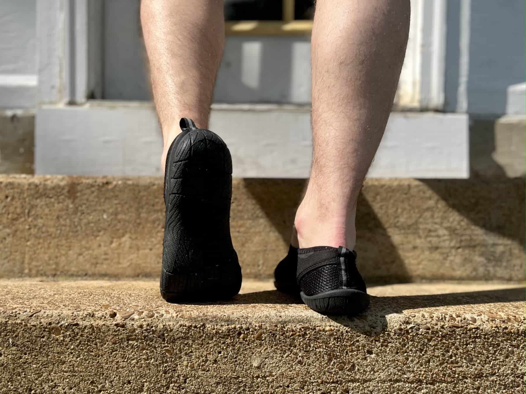 The shoe upper is a neoprene material, and there are no visible drainage holes in the shoe, so we were immediately skeptical that these would drain water effectively. Just based on the look of these water shoes, we guessed they would be better for waterpark or beach days than on a wet hiking trail. The outer sole is just substantial enough that we can’t quite call them water socks, but they are still quite flexible, with little to no arch support for any kind of extensive walking.