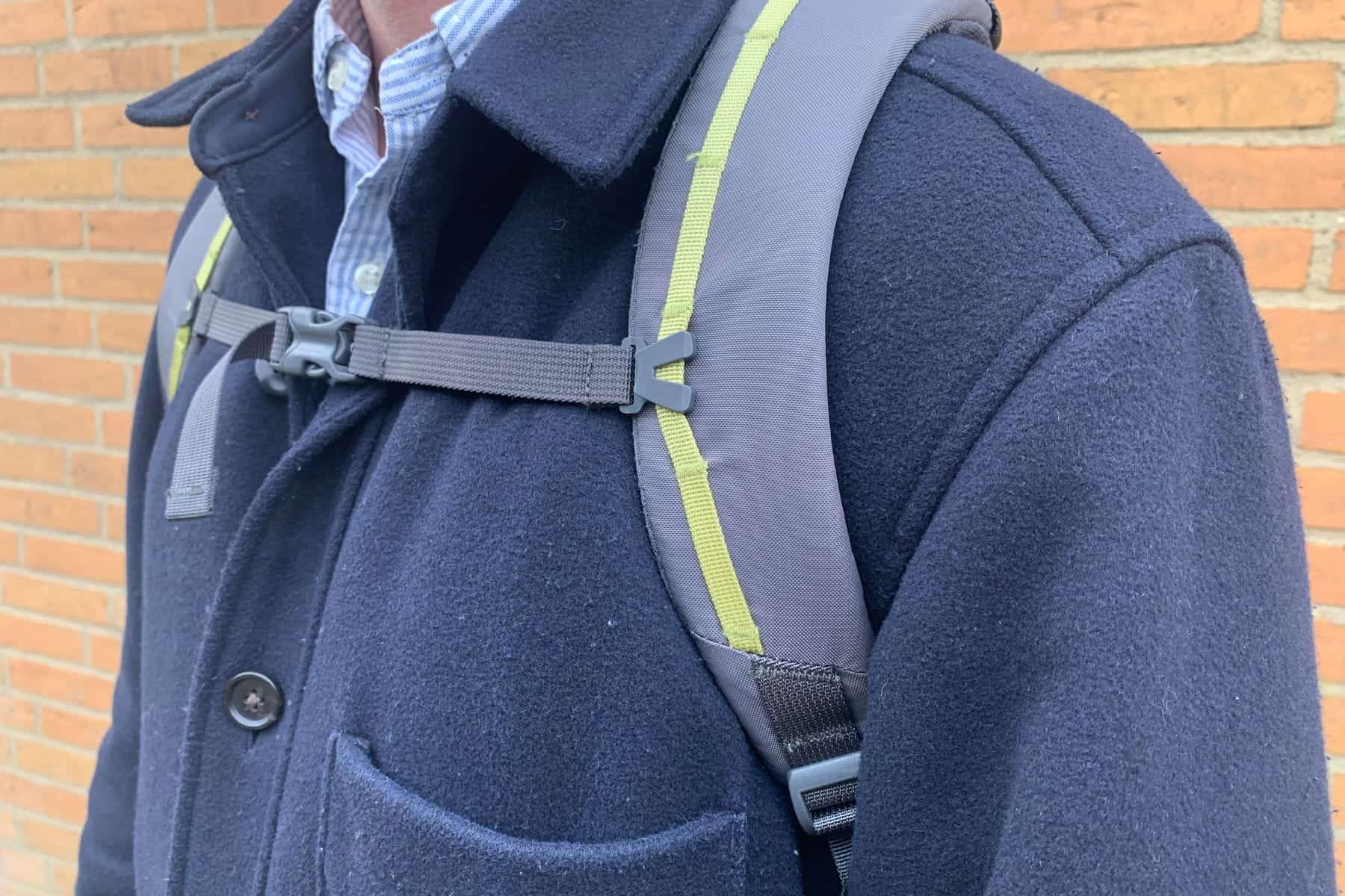 Across the chest, there is a sternum strap. It has an elasticated strap keeper which helps to keep things a little tidier. This sternum strap can be adjusted into 5 different positions along the shoulder straps or removed if you prefer.