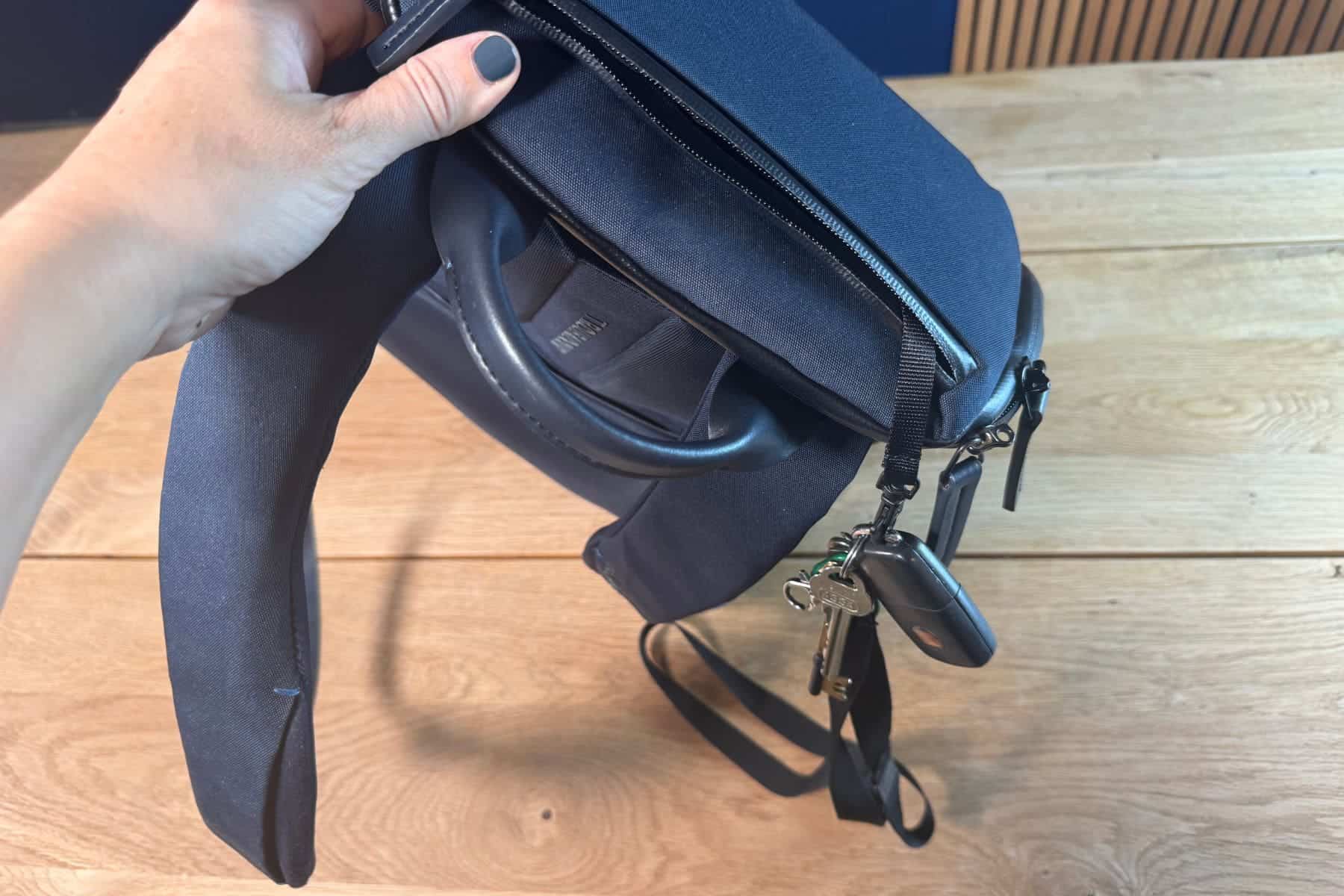 The long leather zipper pulls make handling the pockets easier. It has a distinct and compact shape that does not get in the way of crowded urban commutes. It carries tech safely and organizes things effectively.