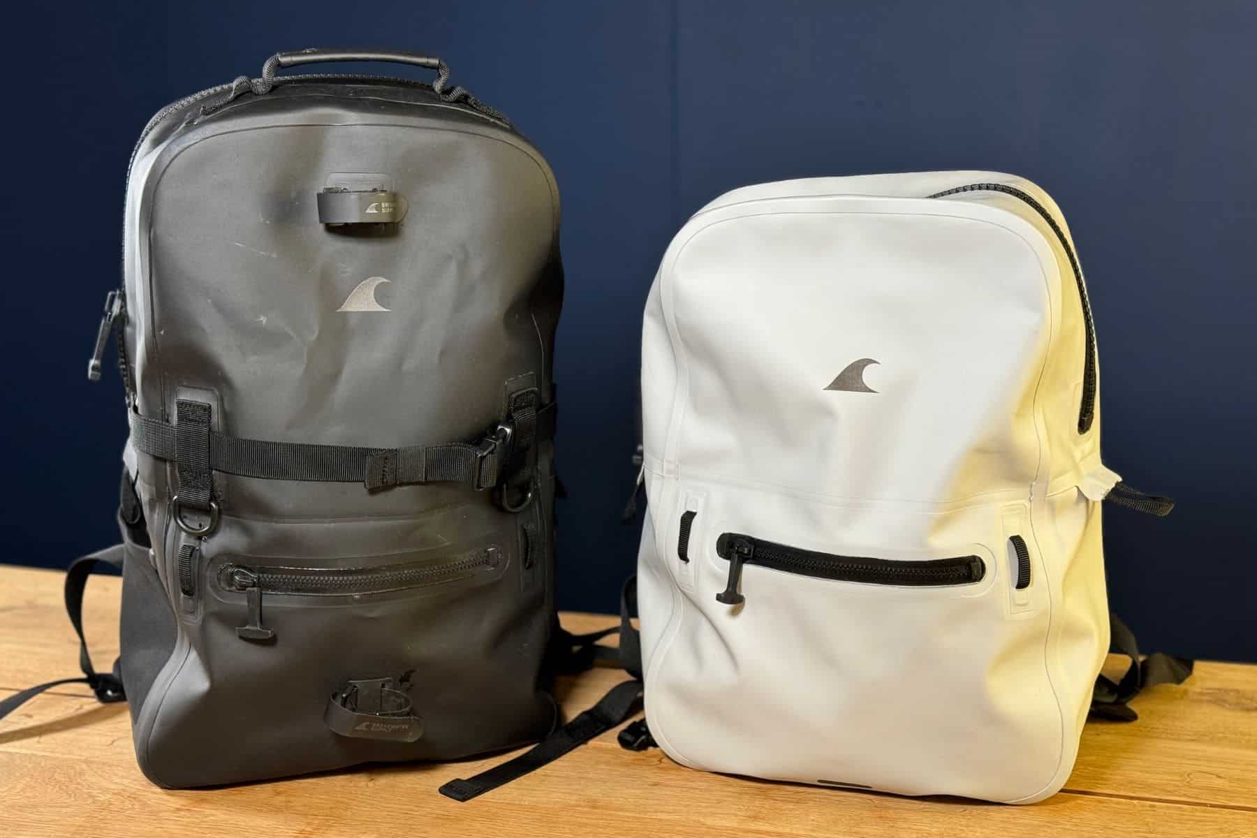 The Fogland Waterproof Backpack 15L in its fog-white color and the 25L in black. We are testing if they are suitable for use in aquatic environments.