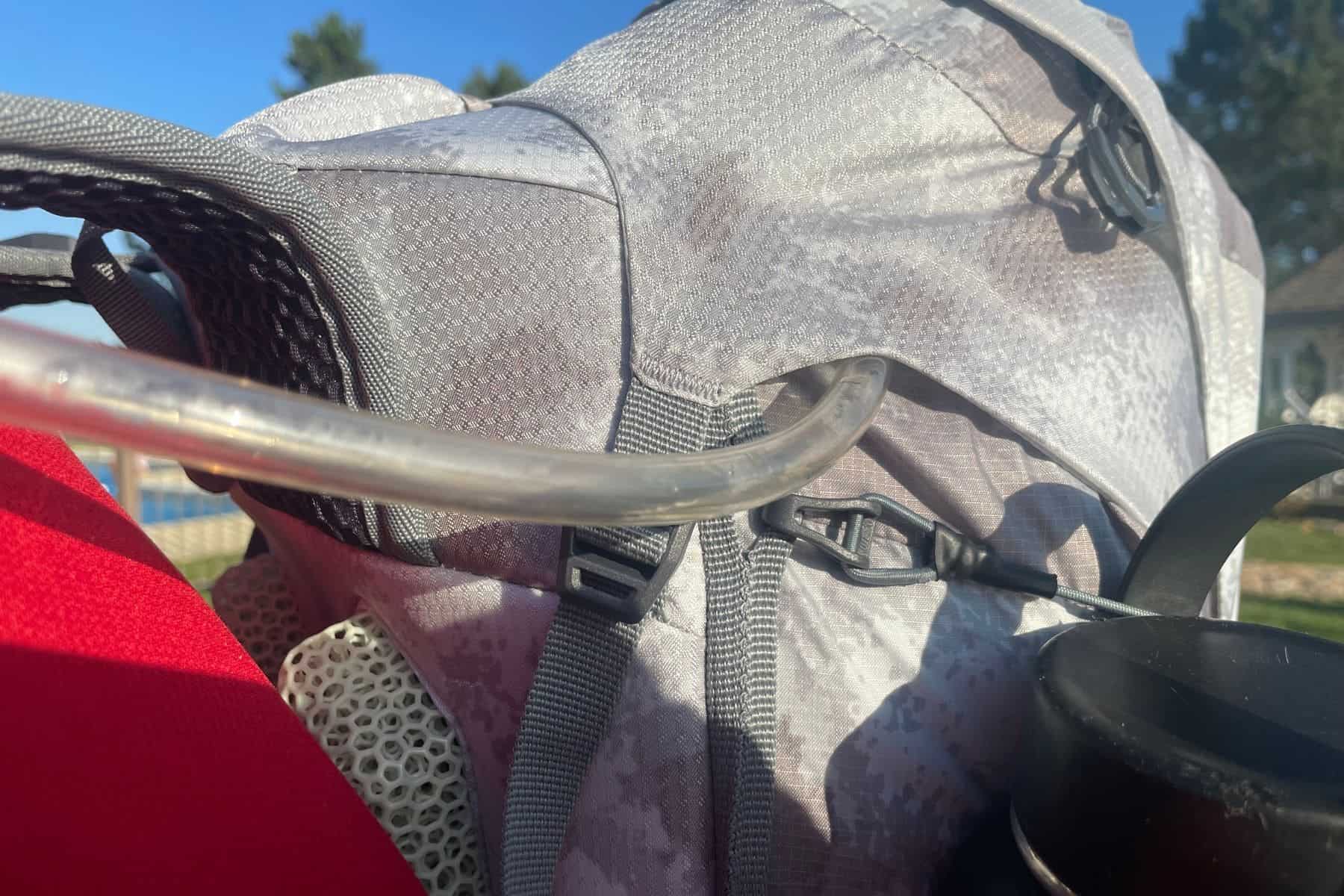 There is a daisy chain of lash points in the front of the bag, with adjustable velcro loops to hold hiking poles or a pickaxe. We are not entirely confident with the durability of the velcro. It is definitely a convenient way to lash things, but we’ll see if it stands up to frequent use.
