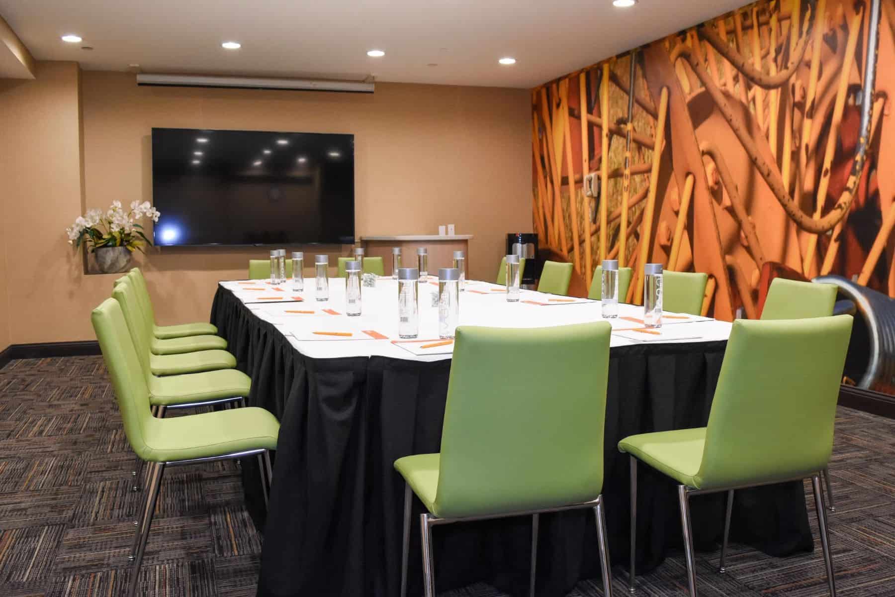 Hardwood floors, vibrant colors, and local agricultural murals bring warmth to the rooms at Hotel Indigo. Comfort meets convenience with amenities such as cable TV, mini-fridges, coffeemakers, and free WiFi.