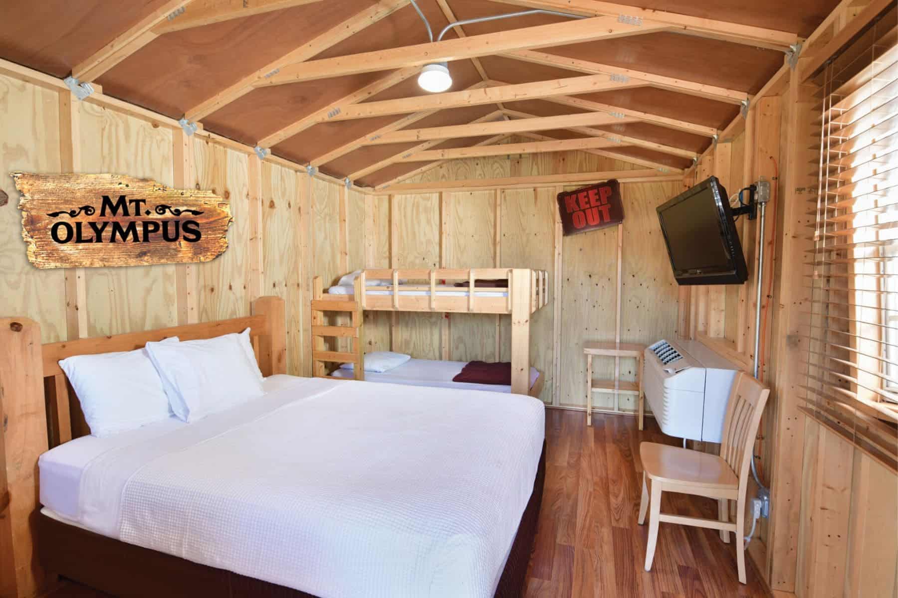 You can also stay at the Mt. Olympus Camp Resort. You can choose between cabins with a queen bed and a bunk bed with or without a bathroom. A separate building has showers and restrooms nearby. Each cabin includes a Picnic Table, BBQ grill, Wi-Fi, air-conditioning, a TV, refrigerator, and microwave.