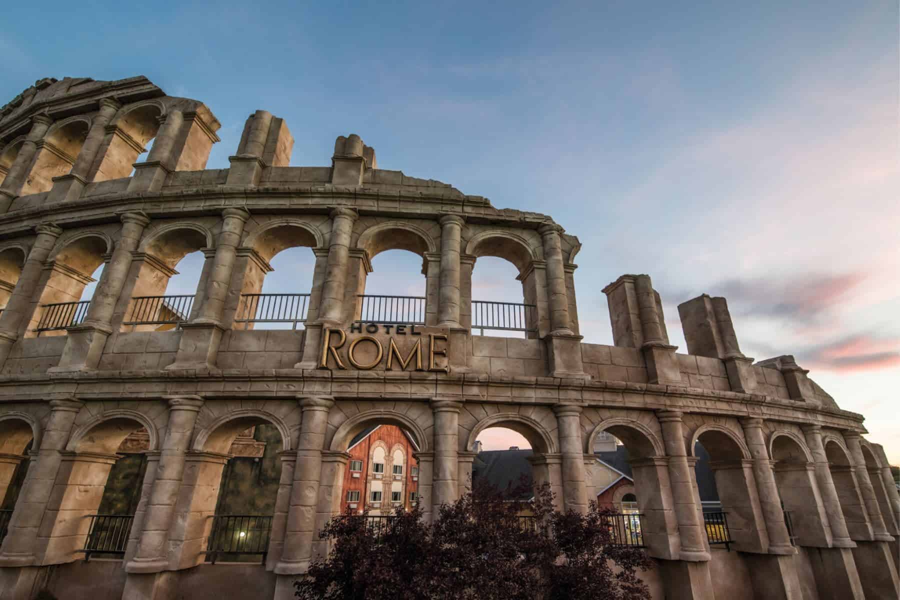 Hotel Rome is the closest to the parks and is connected to the indoor water park. Each room has a TV, Wi-Fi, a mini-fridge, and a microwave. You have a choice of rooms with a queen with bunk beds, two queens, two queens with bunk beds, three queens, or a two-bedroom unit with a queen bed, a sofa sleeper, and a kitchenette.