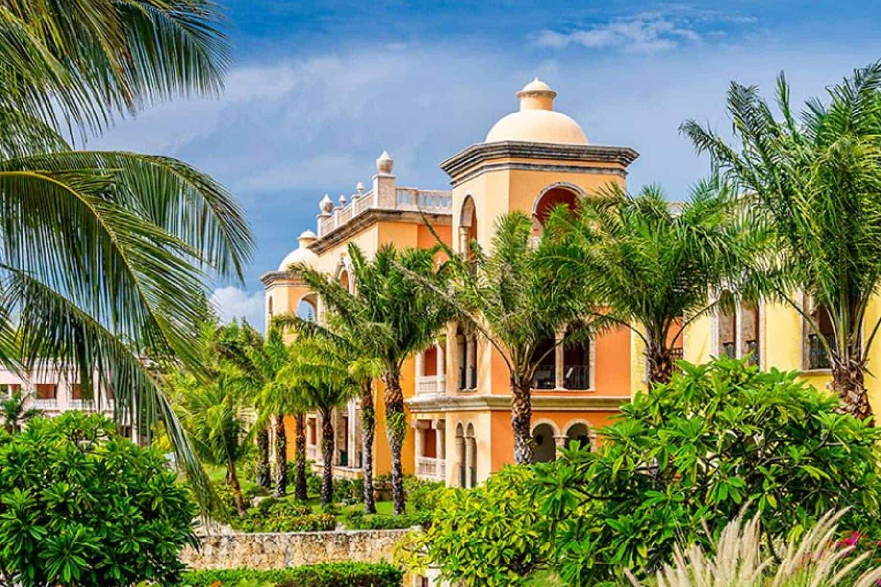 The hotel is constructed in the style of a Spanish colonial castle in between a large, wrap-around swimming pool and the turquoise Caribbean Sea.