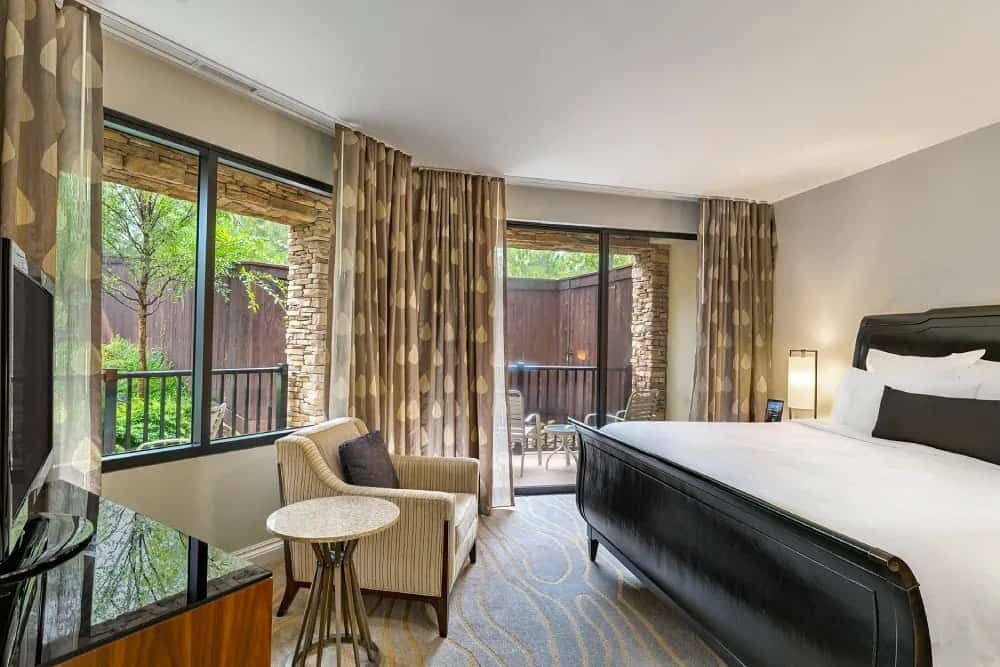 Deluxe, Balcony, and Pool Walkout: These rooms all have the same approximate layout with 425 square feet of space and one king or two queen beds. Views are of the forest, golf course, or pool, and balcony varieties add outdoor space to enjoy them. Pool Walkout rooms are on the ground floor, offering outdoor space plus direct access to the water.