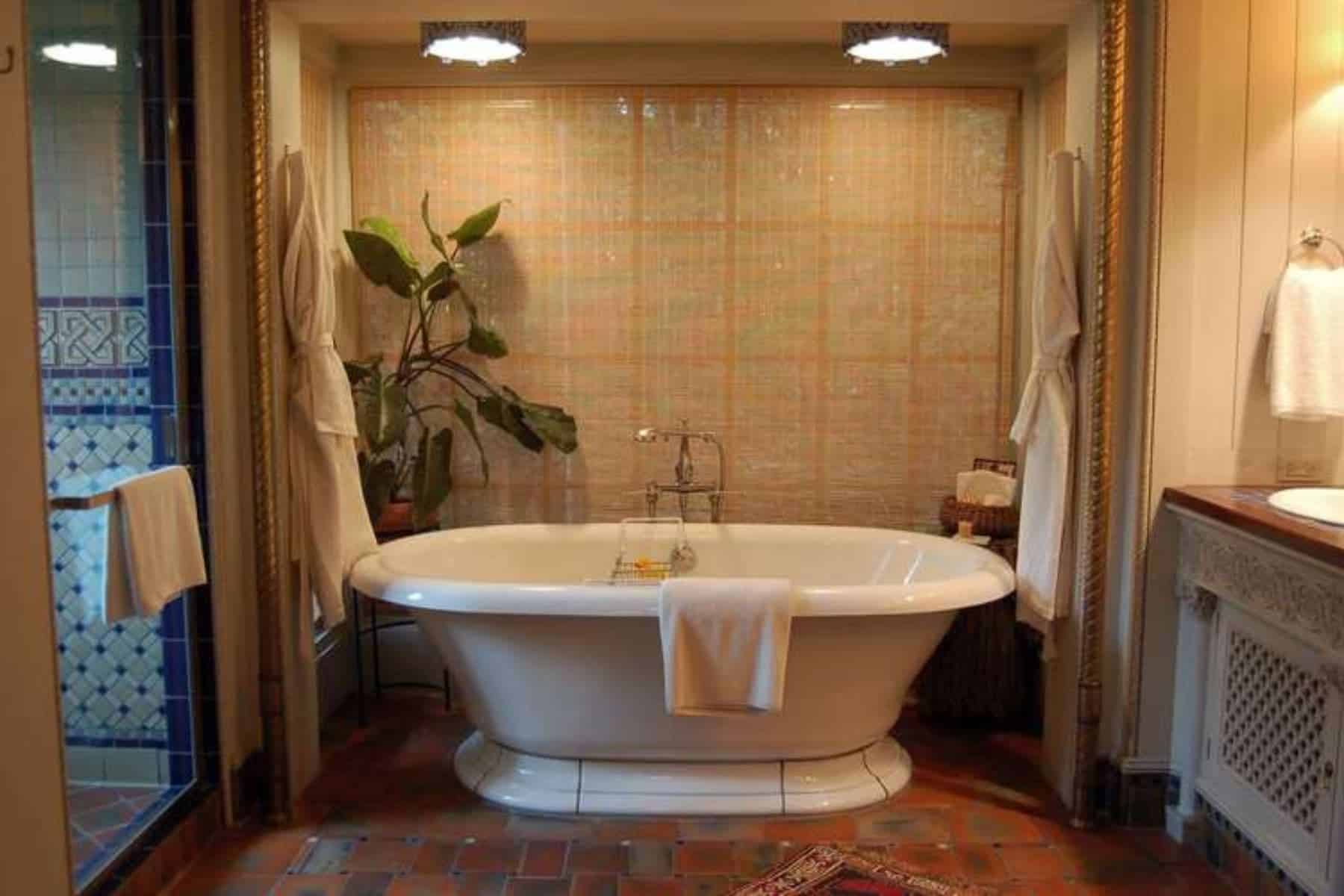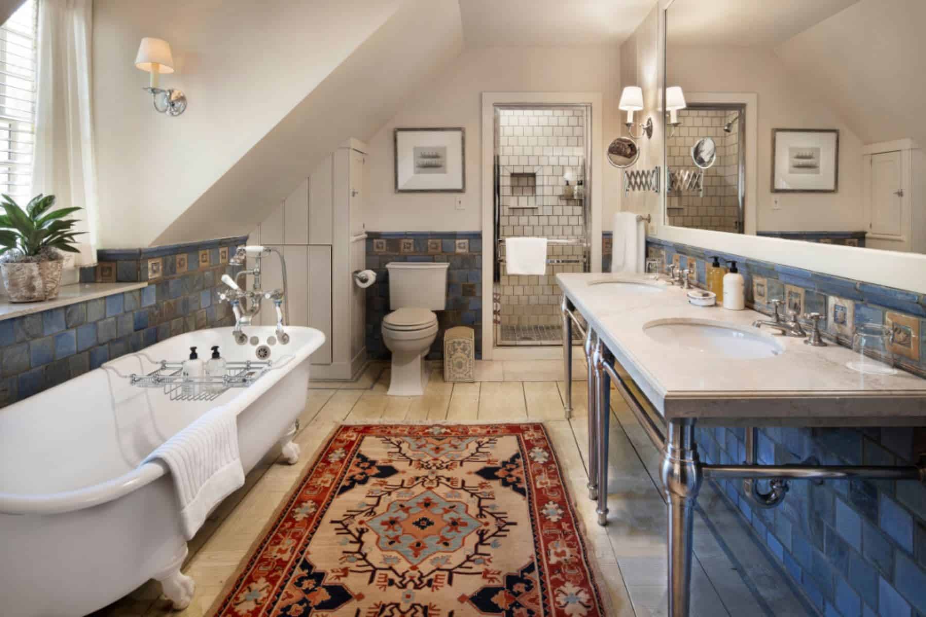 Farmhouse Suites: Four suites with private entrances, connected by a lounge and library, share an outdoor patio and hot tub. Each suite has a large dressing room and bathroom with an enormous soaking tub, separate sleeping and sitting areas, a double-sided gas fireplace opening onto the living room and bedroom, and a private enclosed porch.