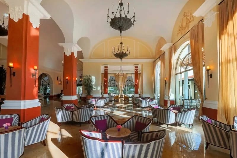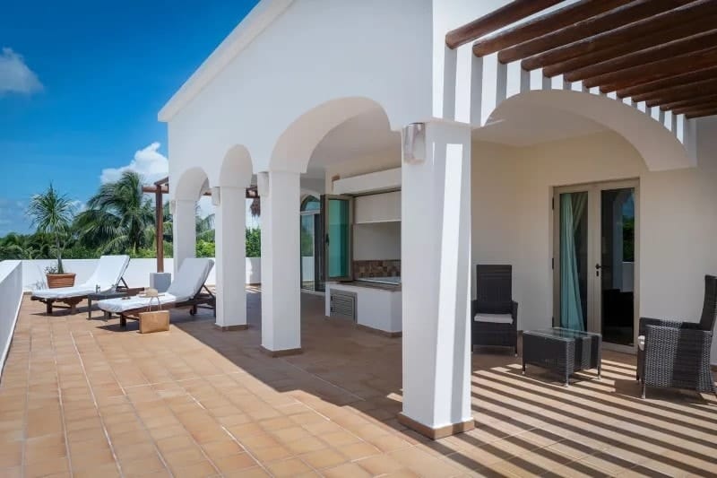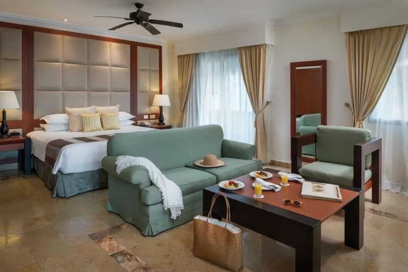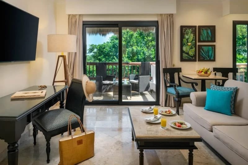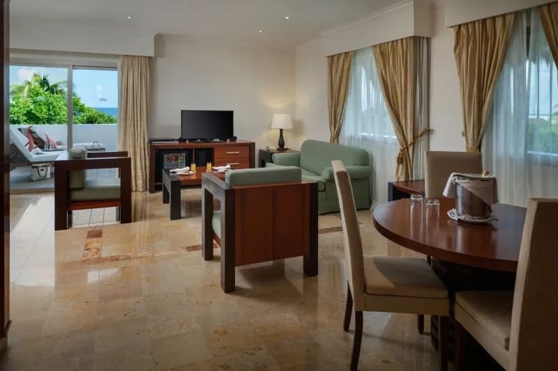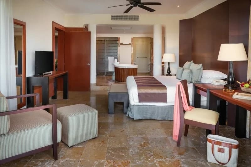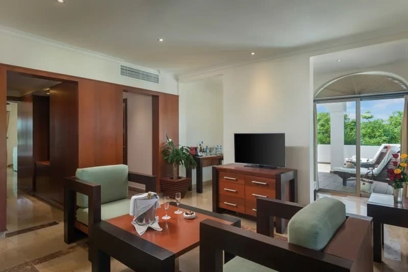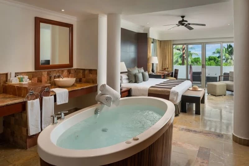 Rooms at the Valentin Imperial Riviera Maya conserve the property’s grand hacienda-style theme. Each of them has a spacious terrace or balcony, a hydromassage bathtub, and smart TV. The different room categories don’t vary greatly in size but do offer different layouts and views.