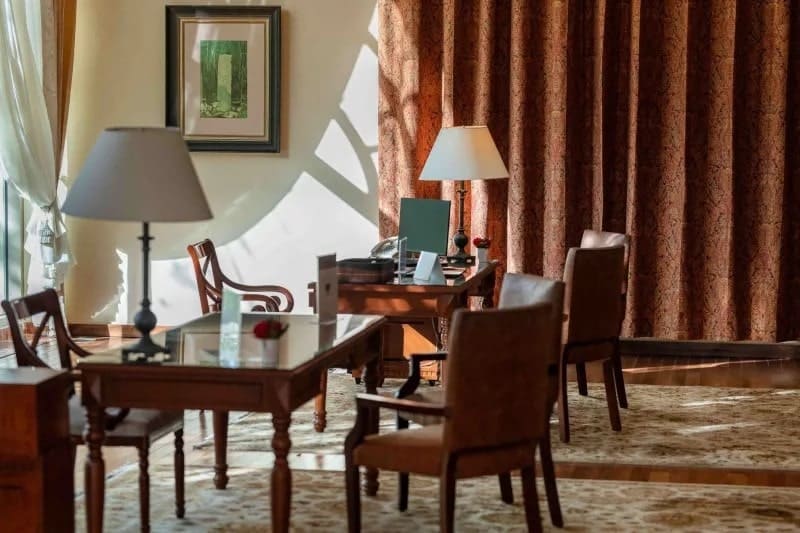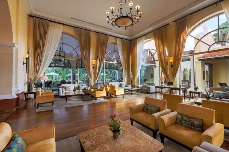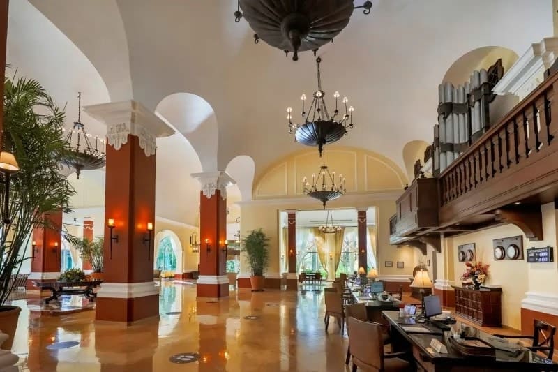 The grounds are well-maintained and buildings feature tasteful decor like marble floors, granite walls, and regal fountains